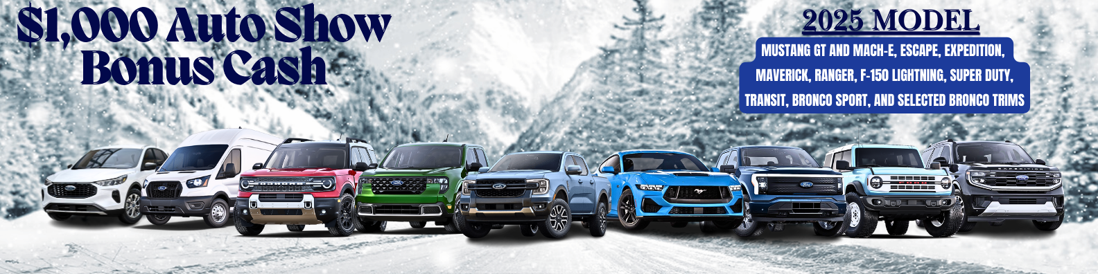 Our $1,000 Auto Show Bonus Cash is applicable to a variety of 2025 Ford models, ensuring there's something for everyone. From the sporty Mustang GT to the versatile Escape and the adventurous Bronco lineup, you can choose the vehicle that best fits your lifestyle. This bonus cash can be used towards your down payment or to reduce your monthly payments, making it easier than ever to get behind the wheel of a new Ford. Don’t miss out on this fantastic opportunity to save on your next vehicle purchase!